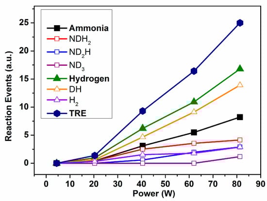 Evolution of reaction events (REs) and total number of exchange reaction events (TRE) for Reaction (1) as a function of plasma power.