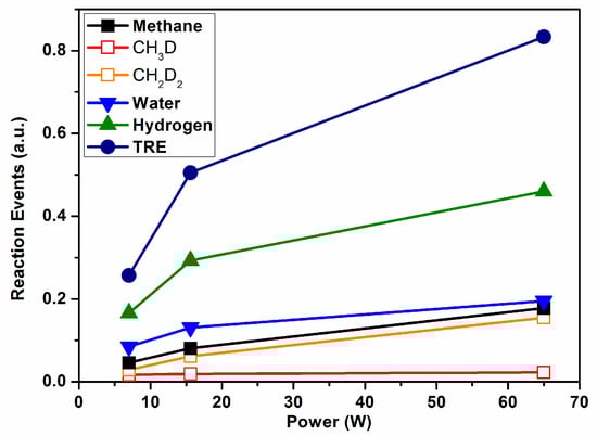 The percentages of the different molecules detected by MS were reported in the literature [], together with the percentage of methane transformed into carbon monoxide and hydrogen in each case (percentages of converted methane through Reaction (2) were 11%, 21%, and 50% for the three applied plasma powers). Figure 4 shows the REs for methane (summing their two labelled variants, also presented in this plot), water (sum of HDO and H2O), and hydrogen (sum of HD and D2), and the total value of TRE as a function of power consumption. The TRE depicts an increasing evolution with power that reveals a progressive increase in the number of inefficient events with this parameter. However, unlike the rather lineal evolution of the TRE reported for ammonia in Figure 3, the evolution of TRE in Figure 4 is characterized by a decreasing slope with power, indicating a certain saturation of the isotopic exchange probability. This tendency suggests that increasing the power may increase the reaction yield, as the number of REs does not progress lineally with it. In agreement with this, a reaction yield of 50% was found for the highest power applied in this experiment []. Another interesting feature deduced from Figure 4 is that, independently of the applied power, the number of events involved in the formation of CH2D2 is much higher than that rendering CH3D. Tentatively, we associated this difference to the known relatively higher stability of CH3* radicals [] and its smaller tendency to saturate the carbon bonds more than other reactive species such as CH2* (in other words, the intermediate reaction CH3* + D* → CH3D would have a much lower cross section probability than CH2* + D* → CH2D*). This isotope labelling result agrees with the current mechanistic models of the wet reforming reaction [].