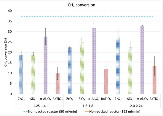 CH4 conversion for different sphere sizes and materials, compared to the results for the non-packed reactor, at the same flow rate (50 mL/min) and at the same residence time (5.52 s; flow rate of 192 mL/min).