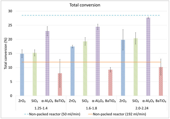 The influence of four different packing materials (SiO2, ZrO2, α-Al2O3 and BaTiO3) and three different sphere sizes (1.25–1.4; 1.6–1.8 and 2.0–2.24 mm diameter) on the CO2, CH4 and total conversion is displayed in Figure 1, Figure 2 and Figure 3, respectively. Figure 1 shows the CO2 conversion in DRM, compared to the conversion that we obtained before for pure CO2 splitting [32], evidencing a clear impact of the presence of CH4. Figure S1 in the Supplementary Materials shows all data on conversion (CO2−, CH4− and total conversion) combined in one graph, for comparison.