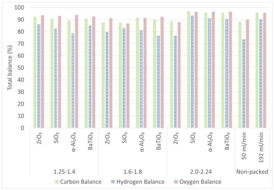 To determine whether all products have been identified by the GC (Gas Chromatograph), we present the mass balances for carbon, hydrogen and oxygen in Figure 6. Important to note here is that part of the deficit is possibly caused by the gas expansion, as explained above (see materials and methods). As can be seen, the carbon, hydrogen and oxygen balances seldom reach 100%. The largest deficit (between 20% and 30% loss of product) is in the hydrogen balance of the non-packed reactor at 50 mL/min, as well as for the BaTiO3 spheres of 1.6–1.8 mm, the α-Al2O3 spheres of 1.2–1.4 mm and the ZrO2 spheres of 2.0–2.4 mm. In all other cases, less than 20% product remains unaccounted for. Moreover, the oxygen and carbon balances reach much higher values: close to 90% (and even up to 95%) and thus less than 10% loss. It thus suggests that mainly products with more than one hydrogen atom are not taken into account in the converted products. We presume that mostly the formation of H2O and the sum of less abundant (oxygenated) hydrocarbons, that were not calibrated on the GC, lie at the basis of these incomplete balances. Indeed, the deficit in the hydrogen balance is for the majority of the experiments double of the deficit in the oxygen balance, suggesting the formation of H2O. An example of a chromatogram, showing the number (and type) of products that have not been calibrated and accounted for in the mass balances, is shown in Supplementary Materials (Figure S15). In addition, also coke deposition could be at the basis of carbon losses. When looking at the Raman measurements (see Supplementary Materials; Figures S16–S23), it is clear that SiO2 and to a limited extent also α-Al2O3 and ZrO2 suffer from coking at the sphere’s surface, unlike the γ-Al2O3 and BaTiO3 spheres. To visually show the amount of cokes deposited on the spheres, photos are added in the Supplementary Materials (Figure S24).