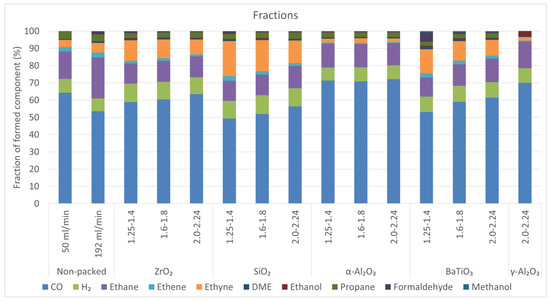 Furthermore, it is clear from Table 4 and Figure 7 that the type of packing material has a vast impact on the product fractions. Moreover, in case of BaTiO3 and SiO2, also the sphere size seems to have a clear impact, while this is much less visible for ZrO2 and α-Al2O3. For example, when high fractions of ethyne are envisioned, the smallest size of the SiO2 spheres seems to be the best choice. The α- or γ-Al2O3 packing seems to produce the highest CO/H2 ratios (see also Table 3), while at the same time producing substantially less dehydrogenated hydrocarbons (ethene and ethyne).