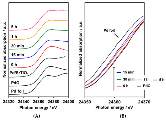 The Pd K-edge XANES spectra of PdCrOx nanoparticles (0–5 h) on SrTiO3: (A) Wide view, and (B) narrow view. The XANES spectra of Pd foil, PdO and Pd/SrTiO3 as references. The order of the K-edge positions is: (Low) < Pd foil ≈ Pd/STO < 15 min < 5 h ≈ 1 h ≈ 30 min < 0 h < PdO < (high).