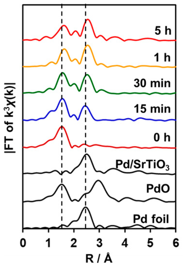 Fourier transforms of k3-weighted Pd K-edge EXAFS spectra for PdCrOx/SrTiO3 prepared for various time periods (0–5 h). Data for Pd foil, PdO and Pd/SrTiO3 are shown as references.