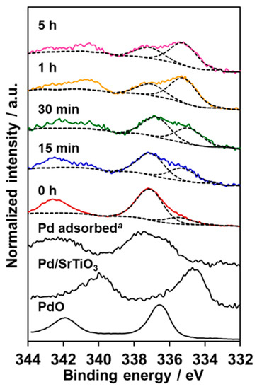Figure 6 shows XPS Pd 3d spectra for the PdCrOx/SrTiO3 samples. All of the Pd 3d peaks can be deconvoluted into two peaks with binding energies of 337.1 and 335.2 eV, which are assigned to oxidized and metallic Pd species, respectively, although the binding energies are slightly different from those in the references (PdO: 336.5 eV; metallic Pd in Pd/SrTiO3: 334.8 eV) [21]. The intensity ratio of the 335.2 eV peak becomes stronger relative to the 337.1 eV peak with an increase in the photoirradiation time, which is consistent with the trend observed in the EXAFS spectra (Figure 5). The details of the surface electronic states of PdCrOx were previously investigated using XPS [16]. The XPS Pd 3d peak position of Pd species co-existing with Cr3+ was thereby determined to be higher than that of bulk PdO(II). In addition, the Pd 3d peak position and structure of PdCrOx was different from the PdO(II) single oxide, and the surface absorbed Pd precursor. Therefore, the 337.1 eV peak is not a single Pd oxide or the Pd precursor but another Pd species that interacted strongly with Cr.