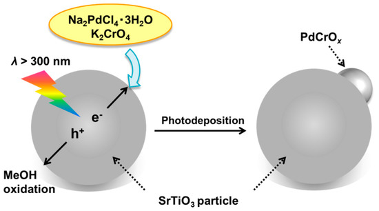 The PdCrOx cocatalyst was deposited on the surface of SrTiO3 by a simultaneous photodeposition method, as reported previously [16]. An amount of 0.2 g of SrTiO3 was dispersed in 100 mL of 10 vol% methanol aqueous solution containing 1.0 wt% Cr (vs. SrTiO3) from K2CrO4 and 0.5 wt% Pd (vs. SrTiO3) from Na2PdCl4·3H2O (FUJIFILM Wako Pure Chemicals Co., Osaka, Japan) as precursors. The solution was completely degassed and irradiated at room temperature for various time periods of 0–5 h. Evolved gases were detected using gas chromatography (GC-3200, Shimadzu Co., Kyoto, Japan) with a thermal conductivity detector (TCD), an MS-5A column and argon as a carrier gas (GL Science Co., Tokyo, Japan).