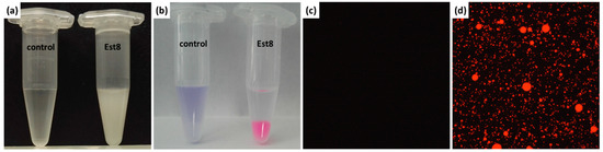 Formation of insoluble oligocarbonate particles. Est8 was used to produce oligocarbonate from dimethyl carbonate and 1,6-hexanediol in 50 mM NaPi, pH 7.4. Both substrates were used at 8% (v/v) or (w/v), respectively. At these concentrations the monomers were completely soluble in the buffer. Samples without the addition of an enzyme were used as negative control. Picture (a) shows the reactions after 1 hour at room temperature while picture (b) shows the same samples after Nile Red staining for 30 min. Fluorescence microscopic images (540–580 nm excitation LED; 605/70 nm emission filter) of the Nile Red-stained samples without addition of enzyme (c) and with Est8 (d) were taken after 1 hour of incubation. In the enzyme reaction, it was observed that the fluorescent spheres grow over time and tend to merge after longer incubation.