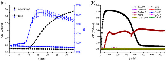 Esterases and lipases catalyze the hydrolysis of esters under physiological conditions. However, their popularity as biocatalysts for the chemical industry is also based on their ability to catalyze transesterification reactions in anhydrous organic solvents. While lipases are activated at the interface of water-insoluble substrates like triglycerides, esterases tend to hydrolyze soluble esters. The availability of a large number of esterases and lipases is based on the presence of various high-throughput assays, which enable their discovery in metagenome libraries or optimization via enzyme engineering. These assays target the natural hydrolase activity and are based on e.g., halo formation in agar plates, detection of the carboxylic acid released, or formation of a chromophore or fluorophore [1,2]. Furthermore, the large number of characterized esterases and lipases allows for the reliable in silico prediction of novel hydrolases from the steadily growing number of sequenced organisms and metagenomes.
