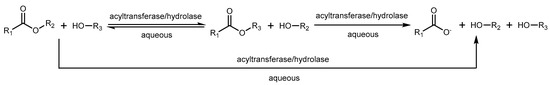 Acyltransferase/hydrolase reaction. The acyltransferase activity allows for the transesterification of an ester with an alcohol in an aqueous environment. The hydrolase activity, which is also present to a certain degree in these enzymes, can lead to direct hydrolysis of the starting ester or the transesterification product. The carboxylic acid produced is deprotonated at neutral pH in the aqueous phase. As the hydrolysis is thermodynamically favored, the accumulation of the transesterification product is only transient.