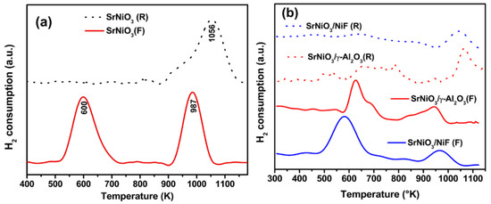 H2-TPR of (a) unreduced (F) and reduced (R) SrNiO3 perovskite unsupported catalysts and (b) SrNiO3 (F and R) supported with γ-Al2O3, and nickel foam catalysts.