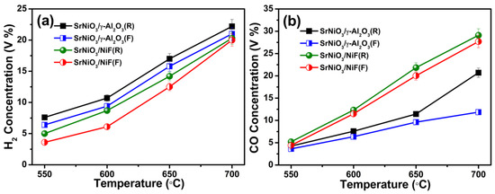 The product of DRP as a function of temperature over SrNiO3/γ-Al2O3 (F and R) and SrNiO3/NiF (F and R) catalysts at 550 °C to 700 °C under atmospheric pressure in CPR = 3 (30:10:60 CO2:C3H8:Ar) and total flow rate = 200 mL/min (a) H2 concentration (vol.%) and (b) CO concentration (vol.%).