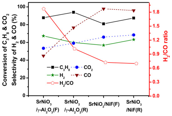 As shown in Figure 9, we could compare the SrNiO3 activity in two different supports materials at the isothermal condition. From the results, the NiF foam-supported catalyst showed superior catalytic activity. It could be active in two forms, and the results were almost the same. These suggested that the NiF could be facilitated the significant interaction of the catalytic surface and efficiently enhance the syngas production, which closes to the stoichiometric reaction. As a result of Figure 9, the SrNiO3/NiF(R) revealed the significant conversion of C3H8 and CO2 among all. Regarding CO and H2 selectivity were 96% and 64%, respectively. Moreover, the H2/CO ratio of the catalyst revealed that reaction mechanism, the SrNiO3/γ-Al2O3(F and R) catalysts showed higher values 1.8 and 1.0, respectively, which suggested that the CO selectivity was less than the H2 selectivity. The CO2 conversion was lower than C3H8 conversion due to the additional CO2 produced by water gas shift reaction (WGSR) (Equation (4)). The WGSR was confirmed by the value of H2/CO ratio higher than 1 [34]. The CO selectivity severely affected due to the predominantly produced CO molecules could react with H2O to produce CO2 and H2. Notably, the SrNiO3/NiF (F and R) catalysts have shown the significant conversion of C3H8, CO2 and higher selectivity of CO than the selectivity of H2. The H2/CO ratio is 0.7, which closes to the stoichiometric reaction value of DRP (Equation (2)). These indicated that the NiF supported catalysts performed excellently in terms of activity, which aid the DRP reaction and also significantly favor the side reaction reverse water gas shift reaction (Equation (5)). The H2/CO ratio would be higher than 1 since this reaction did not occur [47,48].