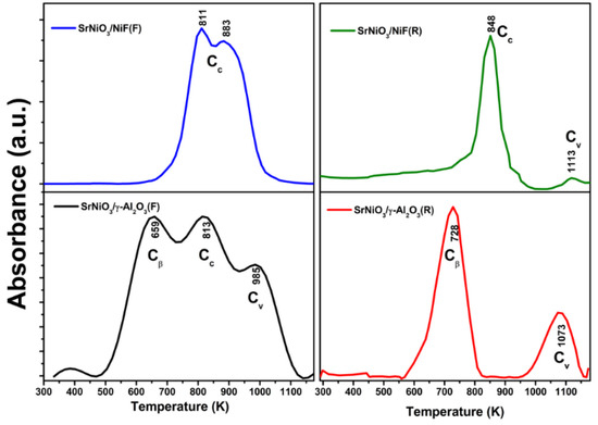 The reduced SrNiO3 perovskite shows the single reduction peak at high temperature, which means the complete reduction of SrNiO3 phase to SrO. The perovskite compound’s reduction occurred at high temperature, which agreed with the previous report [38]. The reducibility of fresh and reduced SrNiO3 perovskite supported with γ-Al2O3 and nickel foam is presented in Figure 4b. The reduction peaks were observed in the supported catalysts significantly matched with unsupported catalysts. The peaks were evolved at lower region 624 °K, 585 °K, and at higher region 948 °K, 970 °K of γ-Al2O3 and NiF supported catalysts confirmed the reduction properties of fresh SrNiO3 perovskite. Those peaks were shifted to the lower temperature than an unsupported catalyst, which shows the interaction of support. The peak was found at around 1054 °K of both supported catalysts, which matched with the reduced SrNiO3 perovskite. The reducibility of the both supported catalysts showed the metal support interaction enhance the accessibility of active species to the reactant.