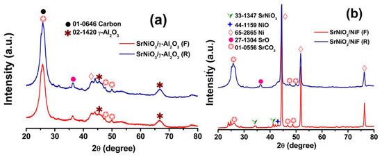 X-ray diffractogram of used catalyst (a) SrNiO3/γ-Al2O3 (F and R) and (b) SrNiO3/NiF (F and R) after DRP for 50 h.