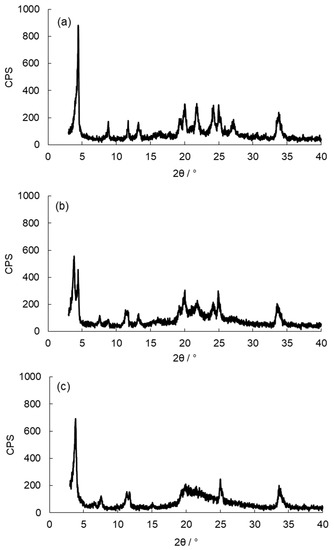 The intercalation of benzimidazole (Bim) into the layers of α-zirconium phosphate (α-ZrP) was carried out by slightly modifying a previously reported method [14]. The α-ZrP was added to a solution of Bim in 1:1 water:methanol. The reaction mixture was stirred at 60 °C for 24 h. After the reaction, the intercalation compound was recovered by suction filtration. The ratio of C, H, and N of the product was C: 27.94%, H: 2.64%, and N: 9.28% and the composition was Zr(HPO4)2(C7H6N2)1.60·0.50H2O as determined by elemental analysis. The interlayer distance of α-ZrP was calculated from the XRD patterns, which showed that pristine α-ZrP 7.6 Å (2θ = 11.7°) was expanded to 20.3 Å (2θ = 4.4°) as seen in Figure 1a. Thus, the intercalation of Bim into the layers of α-ZrP (α-ZrP·Bim) was confirmed.