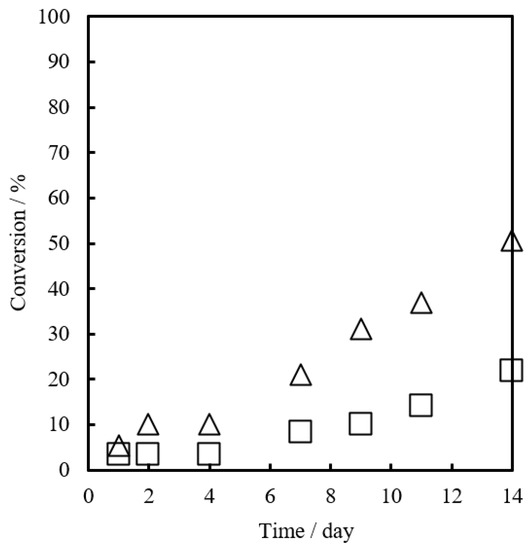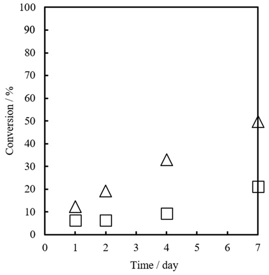 It is important to maintain stability under storage conditions. The stabilities were examined at 25 °C and 40 °C in the GPE-MHHPA system. The conversion of GPE was 51% for Bim and 22% for α-ZrP·Bim at 25 °C for 14 days, as shown in Figure 8. At 40 °C, the conversion was 50% for Bim and 21% for α-ZrP·Bim for 7 days, as shown in Figure 9. The storage stability for α-ZrP·Bim was maintained for 14 days (2 weeks) at 25 °C.
