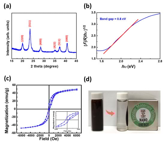 (a) Synchrotron X-ray pattern; (b) Tauc plot for the indirect band gap; (c) magnetic hysteresis loop measured at 10 K of as-synthesized Fe3O4 NPs; and (d) the Fe3O4 suspensions before and after magnetic attraction.