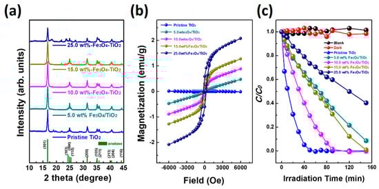 The calcination temperature for the magnetic material is seen as an important factor. For example, as the calcination temperature exceeds 600 °C, it results in a phase transformation from magnetite (Fe3O4) to maghemite (γ-Fe2O3) to hematite (α-Fe2O3) conversions. This phase transformation behavior would cause magnetic material to lose its magnetic properties. In order to maintain the ability to magnetically separate the synthesized TiO2, the calcination temperature was fixed at 550 °C for the study. Figure 2a shows the synchrotron X-ray patterns Fe3O4/TiO2 with various doping concentrations that depend on the Fe3O4/TiO2 ratio (wt %). The characteristic peaks, which centered at 2θ around 16.71°, 24.27°, 24.81°, 25.31°, 31.33°, 34.99° and 35.71°, could be indexed to anatase phase TiO2. Pristine TiO2 exhibited characteristic peaks at 2θ around 18.94°, 19.75° and 22.01° that could be identified as TiO2 low-temperature phase, β-TiO2 monoclinic. With the incorporation of Fe3O4, the anatase phase TiO2 became the only phase in the crystal structure, and no characteristic peaks from other phases could be detected. In addition, the radius of an Fe ion (Fe2+ ~ 0.76 Å, Fe3+ ~ 0.64 Å) is slightly smaller than that of a Ti ion (Ti4+ ~ 0.68 Å), indicating that some of doped Fe ion might enter to interstitial voids of TiO2 lattice [30,44]. The Fe ions in the TiO2 lattice would act as carrier traps, leading to the electron-hole recombination. Taking into account the recombination phenomenon, the photocatalytic performance could be affected when Fe ions were incorporated into the catalyst. When the doping concentration reached 25.0 wt %, both anatase TiO2 and Fe3O4 peaks were detected. The excessive Fe3O4 NPs in the Fe3O4-TiO2 lead to non-uniform doping and to the decrease of the crystallinity of TiO2. From the magnetic hysteresis loop shown in Figure 2b, as the amount of Fe3O4 increased, the magnetization increased as well. In addition, the magnetization was proportional to the doping amount. To optimize the doping concentration, the photocatalytic activity was measured by photoreduction of Cr(VI) in K2Cr2O7 aqueous solution under UV-B irradiation. The photoreduction of Cr(VI) using TiO2-based catalyst usually follows Langmuir–Hinshelwood kinetics. It can be mathematically simplified to first-order kinetics in the early stage described as ln(C0/C) = kt, where C0 is the initial concentration of Cr(VI) in K2Cr2O7, C is the remaining Cr(VI) concentration at various times, k is the apparent reaction rate constant, and t is the photodegradation time. The blank experiment was performed under the same conditions but without the existence of the photocatalyst. For the dark experiment, 10.0 wt %-Fe3O4/TiO2 was also tested in dark conditions to observe the adsorption–desorption behavior. From Figure 2c, 10.0 wt %-Fe3O4/TiO2 calcined at 550 °C showed the highest photoreduction performance among other Fe3O4/TiO2 photocatalysts due to the highest crystallinity among the Fe3O4/TiO2 series. High crystallinity can hinder the recombination of photoexcited electrons and holes and thus result in high photocatalytic activity. With further increasing the Fe3O4 doping concentration to 15.0 wt % and 25.0 wt %, the excessive dopant might destroy the lattice of TiO2, thus decreasing the crystallinity of TiO2 dramatically and form the impurity phases composed of Fe3O4, γ-Fe2O3 and α-Fe2O3. In addition, all of the Fe3O4/TiO2 showed poorer performance compared to the pristine TiO2, which is in accordance with the XRD spectra. The Fe3+ as carrier traps leading to recombination phenomenon and decreased the photocatalytic performance compared with pristine TiO2.