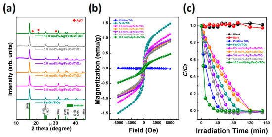 Ag was co-doped with 10.0 wt % of Fe3O4 into TiO2 to improve the electron-hole separation further. Figure 3a shows the synchrotron X-ray patterns of the Ag/Fe3O4/TiO2 series with various Ag doping concentrations that depended on the amount of Ag (mol %) co-doped with 10 wt % Fe3O4/TiO2. The characteristic peaks of Ag/Fe3O4/TiO2 could all be assigned to anatase phase TiO2 without any Ag signal. The results indicated that the incorporation of Fe3O4 and Ag did not destroy the crystal structure of TiO2. The magnetic hysteresis loop (Figure 3b) illustrates that as the amount of Ag increased, the magnetization decreased. When the excessive Ag dopant was 10.0 mol %, it resulted in a decay of saturation magnetization compared to Fe3O4/TiO2, due to the contribution of the volume of non-magnetic material to the total sample volume. Therefore, the magnetism of the 10.0 mol % Ag/Fe3O4/TiO2 was too low for magnetic separation by adding a magnetic field. Figure 3c demonstrates the C/Co curves for photoreduction of Cr(VI) under UV-B irradiation over the Ag/Fe3O4/TiO2 series with different Ag doping concentrations. The blank experiment was also performed under the same conditions but without the presence of the photocatalyst. For the dark experiment, 5.0 mol % Ag/Fe3O4/TiO2 was also tested in dark conditions to eliminate the adsorption–desorption behavior. The 10.0 mol % Ag/Fe3O4/TiO2 showed the highest photoreduction performance, even higher than that of pristine TiO2. Although 10.0 mol % Ag/Fe3O4/TiO2 possessed the highest reduction performance, after considering the ability to be magnetically separated, we selected the 5.0 mol % doping level as the optimal photocatalyst. We could also observe that the photoreduction for Ag co-doped with 10 wt % Fe3O4/TiO2 showed the higher performance after the incorporation of Ag compared to 10 wt % Fe3O4/TiO2. This enhancement could be interpreted by the energy level theory, namely that the conduction band of Fe3O4 is lower than the conduction band of TiO2, so the conduction band of TiO2 becomes an electron capture position. With the further introduction of Ag into Fe3O4/TiO2, Ag could act as another electron trap to enhance the electron-hole separation ability [45].