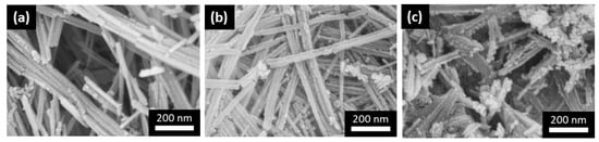 After the optimization process, pristine TiO2, 10.0 wt % Fe3O4/TiO2 (Fe3O4/TiO2) and 5.0 mol % Ag/Fe3O4/TiO2 (Ag/Fe3O4/TiO2) were compared. The FESEM images of TiO2-based NFs before and after combining magnetic NPs and Ag are shown in Figure 4. The image shows that the surface of the pristine TiO2 was very clean and smooth (Figure 4a). When incorporated with Fe3O4 NPs, there was no significant morphological change for the Fe3O4/TiO2 (Figure 4b). For Ag/Fe3O4/TiO2, the surface became relatively rough and some particles aggregated on it (Figure 4c). On increasing the silver content, the surface charge of TiO2-based material would gradually decrease. With small amounts of Ag dopant, Ag2O and AgO might disperse on the surface of TiO2-based material. When increasing Ag doping concentration, the decrease in surface charge was attributed to an agglomeration of the silver species and a reduction to Ag0 on the TiO2 surface [46]. The EDS-characterized elemental compositions and the corresponding results are listed in Table 1. For Fe3O4/TiO2, the ratio of Fe/Ti and Ag/Ti were ~2.9% and ~0.0%, respectively. After incorporating Ag, the ratio of Fe/Ti was ~3.1%, which was approximately the same as Fe3O4/TiO2, and the ratio of Ag/Ti increased to 0.4%. The corresponding ratios of Fe/Ti and Ag/Ti illustrated the existence of Ag in the Ag/Fe3O4/TiO2, together with the leading component Ti and Fe. The distinct signals of these elements present in the spectrum confirmed the successful inclusion of Ag ions into the host TiO2 lattice.