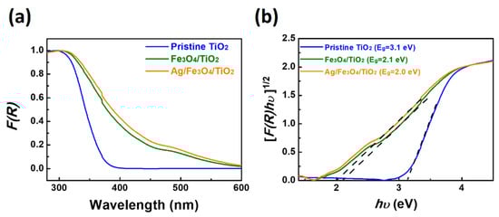 (a) Kubelka–Munk function spectra and (b) Tauc plot for the indirect band gap of pristine TiO2, Fe3O4/TiO2 and Ag/Fe3O4/TiO2.