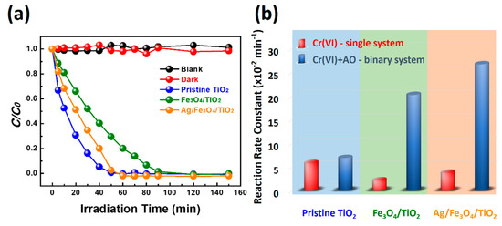 Photocatalytic reaction in (a) Cr(VI) single system and (b) Cr(VI) + AO binary system with pristine TiO2, Fe3O4/TiO2, and Ag/Fe3O4/TiO2.