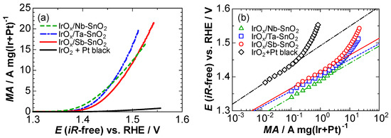 Recently, Kakinuma et al. synthesized several M-doped SnO2 (M = Nb, Ta, and Sb) materials with fused-aggregate network structures as corrosion-resistant cathode catalyst supports for polymer electrolyte fuel cells [29,30,31]. Unique advantages of these supports are their enhanced electronic conductivity and high gas diffusion rate. Onto such M-SnO2 supports, we succeeded in dispersing IrOx nanoparticles as novel anode catalysts for PEMWE. It was found that an IrOx/Ta-SnO2 catalyst exhibited an apparent MA of 15 A mg(Ir)−1 for the OER in 0.1 M HClO4 solution at 1.5 V (iR-free) vs. RHE and 80 °C, which suggests the possibility of reducing the loading of Ir in an anode catalyst to a level as low as 0.1 mg(Ir) cm−2 at a voltage efficiency of 90% (Ecell = 1.65 V) operated at 1 A cm−2, i.e., the anode potential of 1.5 V, cathode potential of −0.05 V, and the ohmic loss of the PEM of 0.10 V [32].