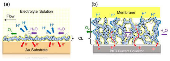 Schematic images of the IrOx/M-SnO2 anode catalyst layer (CL) during the OER in (a) electrolyte solution (half cell) and (b) a single cell.