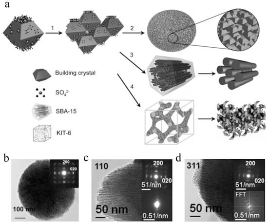 After half a month of Qi’s pioneering work, Lu’s group disclosed the fabrication of anatase TiO2 mesocrystals with a single-crystal-like structure, high specific surface area, preferential exposure of highly reactive (001) crystal facets, and controllable mesoporous network []. As shown in Figure 9, by hydrothermal treating the solution of TiOSO4 in tert-butyl alcohol, anatase TiO2 nanocrystals were firstly generated, the (001) facets of which were preferably adsorbed by SO42− anions. Subsequent oriented attachment of the anatase nanocrystal building blocks created anatase clusters with the (001) facets well protected (step 1). Upon further attachment of the building blocks, anatase TiO2 mesocrystals preferentially exposed by (001) facets and having a disordered mesoporous network were finally produced (step 2). It is noteworthy that when the growth was confined in a scaffold with ordered pore channels, such as mesoporous silica containing 2D (SBA-15, P6mm space group) and three-dimensional (3D) (KIT-6, Ia3d space group) ordered mesopores, the subsequent scaffold removal would lead to TiO2 crystals with replicated 2D hexagonal (step 3) or 3D (step 4) ordered network structure, respectively. More interestingly, such a novel methodology could be extended to fabricating mesoporous single-crystal-like structures with other compositions (e.g., ZrO2, CeO2, etc.), thus providing promising materials for various applications.