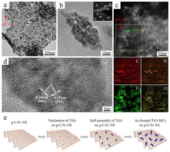 (a,b) TEM and (c) HRTEM images of 33.3% g-C3N4/DTMCs. The inset is the SAED pattern related to the whole particle. (d) HAADF-TEM image with elemental mapping of 33.3% g-C3N4/DTMCs. (e) Schematic presentation of the in situ growth of TiO2 mesocrystals on a g-C3N4 nanosheet. Reprinted with permission from []. Copyright John Wiley & Sons Inc., 2018.