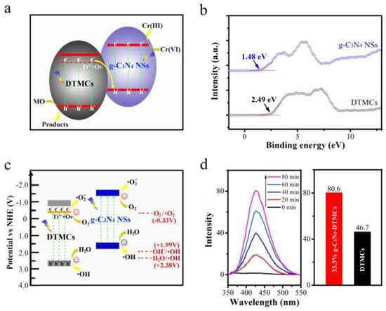 (a) Proposed Z-scheme charge-carrier transfer within DTMC/g-C3N4 composite. (b) XPS valence band spectra and (c) schematic electronic band structures of DTMCs and g-C3N4 NSs. (d) ·OH-trapping PL spectra of DTMCs/g-C3N4 and the corresponding fluorescence intensity upon DTMCs/g-C3N4 in comparison to DTMCs. Reprinted with permission from []. Copyright John Wiley & Sons Inc., 2018.