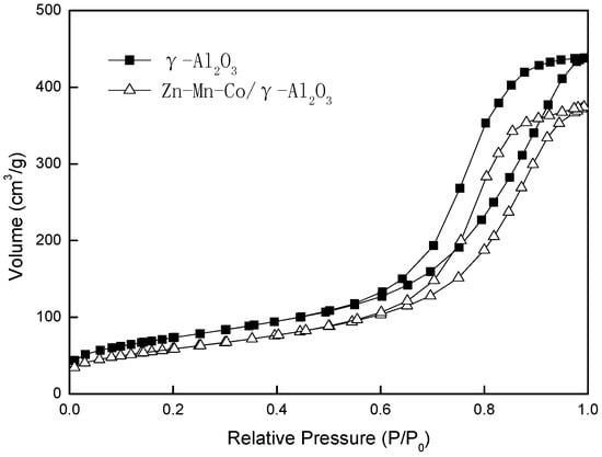 Cryogenic nitrogen adsorption-desorption isotherms for γ-Al2O3 and Zn-Mn-Co modified γ-Al2O3.