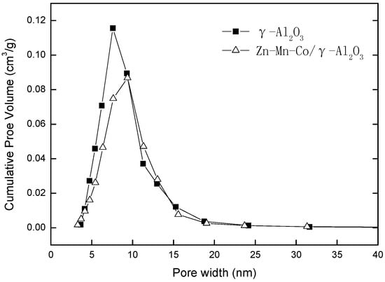 Figure 2 shows the nitrogen adsorption–desorption isotherms at liquid nitrogen temperature (77 K) for γ-Al2O3 and Zn-Mn-Co modified γ-Al2O3 samples. Both of the isotherms belong to type IV, and the close hysteresis loops were classified as H3 [24]. The specific surface areas, average pore size, and total pore volume of the catalysts are presented in Table 1. The specific surface area of Zn-Mn-Co/γ-Al2O3 was smaller than that of γ-Al2O3, and the total pore volume was reduced by 15% after modification. However, the average pore radius had a slight increase. This may be due to the modification of the metal ions: some of the micropores were blocked. Figure 3 shows the pore size distribution and cumulative pore volume obtained for the catalysts. The pore sizes of both catalysts were mainly distributed in the range of 5–20 nm. The number of micropores in the modified catalyst was less than that in the original sample, which further proved that the modification of metal ions blocked some of the micropores.