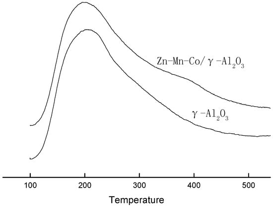 The pyridine temperature-programmed desorption (Py-TPD) profiles of γ-Al2O3 and Zn-Mn-Co modified γ-Al2O3.