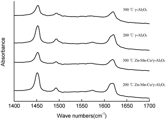 The pyridine temperature-programmed desorption (Py-TPD) profiles of γ-Al2O3 and Zn-Mn-Co modified γ-Al2O3 are shown in Figure 4. The desorption peak at 200 °C was enhanced after modification, which proved that there were more weak acid sites on Zn-Mn-Co modified γ-Al2O3. A weak desorption peak appeared at 390 °C, indicating the increase of strong acid sites. The surface acidity values of γ-Al2O3 and Zn-Mn-Co modified γ-Al2O3 were quantified by pyridine adsorption IR spectra (Figure 5 and Table 2). The bands distinguished at 1620 cm−1 were assigned to pyridine coordinated to tetrahedral and octahedral Al3+. The area of the 19b band at 1451 cm−1 was used to quantify the total amount of Lewis acid sites (LAS) using its molar adsorption coefficient (ε = 1.5 cm/μmol) [10,26,27,28]. The amount of LAS is given in Table 3. The acidic concentration of total acidity and the strong LAS were measured at 200 °C and 300 °C, respectively. After being modified by zinc, manganese, and cobalt, the total acid content of the catalyst increased by about 10.5%.