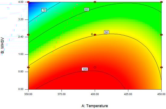 The interaction effects of reaction temperature and WHSV on 1-butanol dehydration were investigated by response surface methodology (RSM). The experimental scheme in this study was designed by Design-Expert 8.0.5 Trial. The catalytic performance was evaluated using the butene yield. In order to express the effect of factors including reaction temperature and WHSV on the dependent variable (Y), the responses were fitted by the regression model expressed in Equation (2). The optimal point was predicted by a quadratic model, which was expressed as: