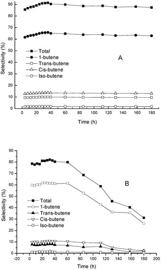 Dehydration of 1-butanol under optimal conditions (375.78 °C and 1.67 h−1 of WHSV) (A): Zn-Mn-Co modified γ-Al2O3. (B): Unmodified γ-Al2O3.