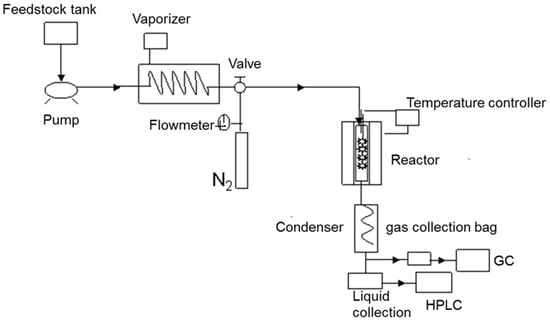 The experiments on the catalytic dehydration of 1-butanol were performed in a micro-reactor device (Figure 8). First, 1.3 g 20–40 mesh catalyst was loaded in the middle of a reactive tube, fixed bed reactor (440 mm length, 8 mm I.D.), and the space under the catalyst bed in the reactor was filled with ceramic chips. The catalyst was pretreated at 450 °C in N2 for 1 h and then cooled to the test temperature. The feed rate of 620 g/L 1-butanol solution was controlled by a micro peristaltic pump, and the 1-butanol was vaporized by a vaporizer.