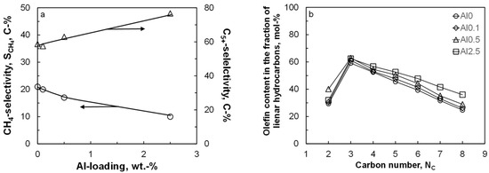 Olefins are the major, primary product of the Fischer–Tropsch synthesis, even when cobalt is used as the catalytically active material [27]. The primarily formed olefins can re-adsorb and undergo secondary reactions, such as hydrogenation, double-bond isomerization, and reincorporation in the chain growth scheme [31]. Figure 2 shows the expected behavior for the olefin content in the fraction of linear hydrocarbons as a function of carbon number: a rather low olefin content in C2 due to the high reactivity of ethene, and a decrease in the olefin content in the fraction of linear hydrocarbons with increasing carbon numbers from C3 onwards due to the increased concentration of these compounds in the liquid phase [34]. The olefin content in the fraction of linear hydrocarbons increases with increasing aluminum content (except for the olefin content in the fraction of C2 hydrocarbons). This indicates a reduced extent of secondary hydrogenation of the primarily formed long-chain olefins in the Fischer–Tropsch synthesis possibly due to an increased coverage of the surface with carbonaceous species and thus lower hydrogen availability on the surface.