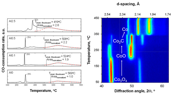 Figure 3 shows the profiles obtained from the temperature-programmed reduction in the presence of CO (CO-TPR) for the alumina-modified catalysts. The profiles for the samples with an aluminum content of 0.5 wt.% or less are characterized by a minor peak at ca. 240 °C, a sharp peak at 295 °C, a small feature at 320 °C, and a broad feature above 500 °C. The CO-TPR was followed using in situ XRD (see Figure 3, right). It can be seen that the reduction of Co3O4 in the presence of carbon monoxide starts at ca. 210 °C with the formation of CoO, showing that the first feature in the CO-TPR can be ascribed to CO consumption for the reduction of Co3O4 to CoO. This is subsequently transformed into Co2C (at ca. 295 °C). This will be accompanied by a large amount of CO consumed, thus appearing as a large peak in the CO-TPR at these temperatures. It can thus be concluded that the transformation of Co3O4 into Co2C proceeds sequentially, Co3O4 → CoO → Co2C, as discussed before [36]. At temperatures around 350 °C, the transformation of Co2C to metallic cobalt can be observed in the in situ XRD experiment. This does not appear to be associated with any additional consumption of carbon monoxide. It is thus concluded that at these temperatures, in the presence of carbon monoxide, cobalt carbide transforms into metallic cobalt (with the co-generation of carbon and the simultaneous disappearance of cobalt carbide). The decomposition of Co2C in the presence of carbon monoxide into metallic cobalt and carbon is observed with this sample at ca. 365 °C, i.e., at slightly higher temperatures than in the presence of argon [38]. It has been argued that cobalt carbide can be observed if the decomposition of the meta-stable Co2C phase is kinetically hindered [38]. The presence of CO in these experiments would have resulted in an increase in the chemical potential of carbon and thus an increase in the decomposition temperature.