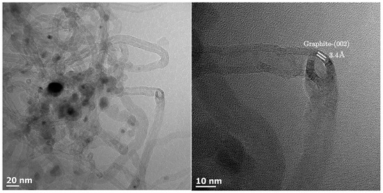 Carbon deposition by the Boudouard reaction could be visualized using TEM imaging of the sample Al0.5 after CO-TPR (see Figure 4). The image shows metal particle sizes within the expected range if only minimal sintering has taken place. It appears that a reduction in CO inhibits the sintering process observed for H2 reduction (see Table 1). The metal particles are encapsulated by material appearing such as multi-wall carbon nanotubes. The d-spacing of this material was determined to be 3.4 Å, which is consistent with graphitic carbon [40,41]. The internal diameter of the carbon nanotubes appears to be in the range of 9–11 nm. The internal diameter is thought to be linked to the metal particle size [42] (the reduction of Co3O4 particles with a size of 14 nm is expected to yield in the absence of sintering metal particles with a size of 10–11 nm).