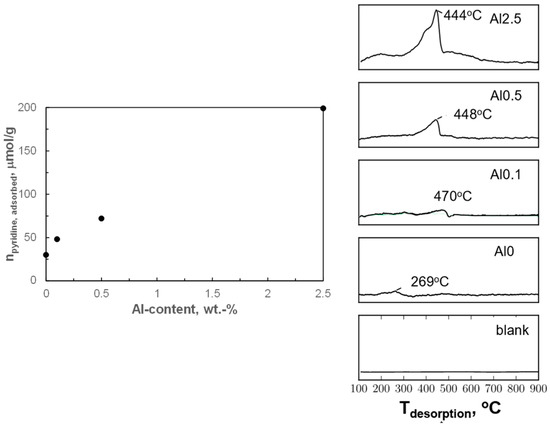Pyridine desorbed at a relatively low temperature of 269 °C from the sample containing no aluminum (Al0), indicating rather weakly adsorbed pyridine. A sharp peak between 350–500 °C was observed during pyridine TPD for the alumina-modified samples. Sharp peaks above 350 °C have been reported to correspond to the decomposition of pyridine to N2 and CO2 [45,46]. The catalyst had also darkened after the experiment, which may suggest carbon deposition [45] indicating that pyridine decomposition may have occurred during the pyridine TPD. Hence, the position of the peak is expected to correlate with the rate of pyridine decomposition rather than the rate of pyridine desorption (and thus the peak area with the thermal conductivity of the decomposition products). The decomposition of pyridine at temperatures below 500 °C, in an inert atmosphere, is only catalyzed by strong acid sites [46,47]. The pyridine TPD experiments indicate that the acid sites on the activated modified samples were strong enough to catalyze the decomposition of pyridine at temperatures below 500 °C.