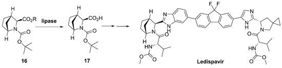 The possibility of performing chemoselective reactions is another attractive property of lipases. In this sense, a patent from AstaTech Chengdu Biopharmaceutical Co., Ltd. granted in 2018 [102], reports the use of several lipases (Novozym 435 and lipase from pig pancreas leading to the best results) and esterases for the hydrolysis of different alkyl esters of N-Boc-(1R,3S,4S)-2-azabicyclo[2.2.1]heptane-3-carboxylate (16, Scheme 7), to yield acid 17 without removing the carbamate protecting group. In this process, essential for the preparation of ledispavir (Harvoni®, Gilead, in combination with sofosbuvir (see Scheme 14) for treatment of hepatitis C [103], the enzymatic hydrolysis allows the preparation of 17 in good yields (up to 77%) and high d.e. values (up to 99.7%), therefore avoiding the main problem of the chemical basic hydrolysis (LiOH in THF/H2O), a partial racemization of the stereogenic center at Cα of the alkoxycarbonyl group.