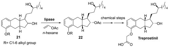 Treprostinil (Remodulin®, Orenitram®, Tyvaso®, Scheme 10), a synthetic analog of prostacyclin (PGI2), is a vasodilator used for the treatment of pulmonary arterial hypertension [112], of which synthesis is complex and time consuming [113]. In a patent from Everlight Chemical Industrial Corporation granted in 2016, a stereo- and regioselective acylation of diol 21 with vinyl acetate, performed in n-hexane at 22 °C with lipase AK from Amano, leads to the regioselective acylation of the hydroxyl group in the cyclic moiety of 21 without acylating the one on the exocyclic chain, and leading to the desired stereochemistry of 22 (no yields or ee reported).
