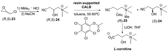 In another patent from Wuxi Fortune Pharmaceutical Co., Ltd., granted in 2018 [114], the gram-scale kinetic resolution (Scheme 11) of racemic hidroxynitrile (R,S)-24, obtained from racemic epyclorhydrine (R,S)-23, was reported using an enzymatic transesterification with perchlorophenyl acetate and lipase B from C. antarctica, supported on an acid resin (Novozym 435?), to obtain acetate (R)-25, which hydrolysis leads to L-carnitine, an essential co-factor in the metabolism of lipids involved in the generation of cellular energy [115,116].