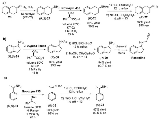 The resolution of chiral amines is a very attractive research area, because of the plethora of applications described for such enantiopure compounds [117,118], which can be obtained by using oxidoreductases [119] (see Section 3.2), transaminases [120] (Section 4), and lipases [121,122], as we will comment here. In fact, different companies have been actively working in this area during the last years. For instance, in patent granted in 2018 [123], a methodology for preparing enantiopure (R)-1,2,3,4-tetrahydronaphthalen-2-amine (2-aminotetralin, 2-AT, (R)-27, Scheme 12a), a rigid analogue of phenylisobutylamine capable to inhibit the reuptake of serotonin and norepinephrine [124] was reported. In this case, the reaction was carried out in a 2 L autoclave filled with 1 L of toluene, 117.6 g of (R,S)-27 (obtained via reductive amination of starting ketone 26), 172 g of (R)-O-acetyl mandelic acid, commercial Novozym 435 and H2/nickel catalyst (KT-02) to transform the kinetic resolution into a dynamic kinetic resolution by racemizing the unreacted (S)-27. After 24 h, 144.2 g of (R)-28 (95% yield, 99% ee) were isolated and subsequently hydrolyzed to finally yield (R)-28 with excellent yield (92%) and enantiopurity (99%).