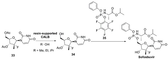 The lipase capability for catalyzing site-selective acylations/deacylations has been also exploited in recently granted patents. For instance, a HC-Pharma AG patent granted in 2018 [129] describes the mono-deacetylation of 33 (Scheme 13), a precursor in the preparation of sofosbuvir (Sovaldi®, Gilead), a direct acting antiviral medication used as part of combination therapy to treat chronic hepatitis C [130].
