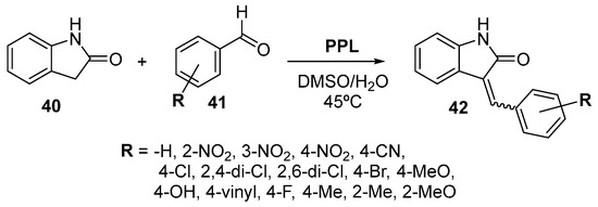 To finish this section, we will illustrate an example of the well-known lipase promiscuity [68,86,152,153]. Thus, in a patent from Nanjing Tech University granted in 2018 [154], different lipases (lipase from pig pancreas (PPL) leading to the best results) were used for catalyzing the Knoevenagel condensation between indolin-2-one (Scheme 16, 40) and different aromatic aldehydes 41 to synthesize the corresponding 3-arylidene derivatives 42, useful in the synthesis of indole alkaloids with many therapeutic activities (antibacterial, antitumor or anti-inflammatory). Different reaction conditions were tested (solvent, temperature, etc.), being the best results obtained with a mixture of water/DMSO (1/4, v/v) and 45 °C.