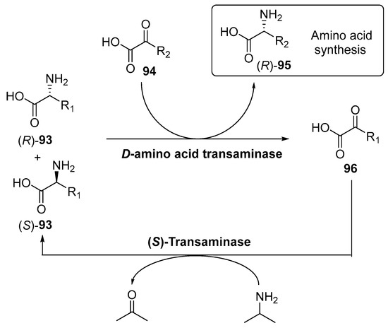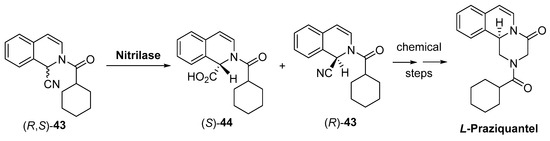 Likewise, nitrilases have been extensively characterized and protected over the last five years. Companies like BASF [160,161,162,163] and c-LEcta [164] have patented novel sequences of nitrilases, with potential use in biocatalysis in asymmetric synthesis. In addition, some other activities cover sequences applied to specific targets for pharmaceuticals and fine chemicals. For instance, nitrilases are used to generate chirality in the synthesis of precursors of L-praziquantel, a drug employed against parasitic worm infections [165,166]. Nitrilases from Arabidopsis thaliana, Aspergillus niger or Alcaligenes faecalis are claimed in a patent granted in 2014 from Suzhou Tongli Biomedicine Co., Ltd., to perform the kinetic resolution of nitrile 43 (Scheme 17) [167] to obtain the enantiopure (R)-43, needed for the synthesis of the required drug.