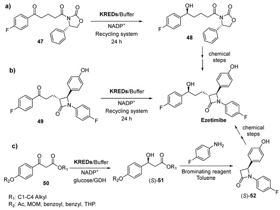 Thus, a patent granted to Codexis Inc. described the preparation of ezetimibe (Zetia®, Ezetrol®, amongst other), a drug employed to treat high blood cholesterol and other lipids abnormalities [191,192,193], using different engineered KREDs from Lactobacillus brevis, Lactobacillus kefir and Lactobacillus minor in a patent granted in 2014 [194]. The ezetimibe precursor 5-((4S)-2-oxo-4-phenyl-(1,3-oxazolidin-3-yl))-1-(4-fluorophenyl)pentane-1,5-dione (47) was selectively reduced to (4S)-3-[(5S)-5-(4-fluorophenyl)-5-hydroxypentanoyl]-4-phenyl-1,3-oxazolidin-2-one (48), as depicted in Scheme 19a, with complete selectivity and conversions higher than 95% after 24 h. Glucose and glucose dehydrogenase (GHD) were employed as secondary enzymatic system to regenerate the NADP+ consumed during the bioreduction. Substrate concentrations were at least of 100 g/L whereas 5 g/L of biocatalyst can be employed.